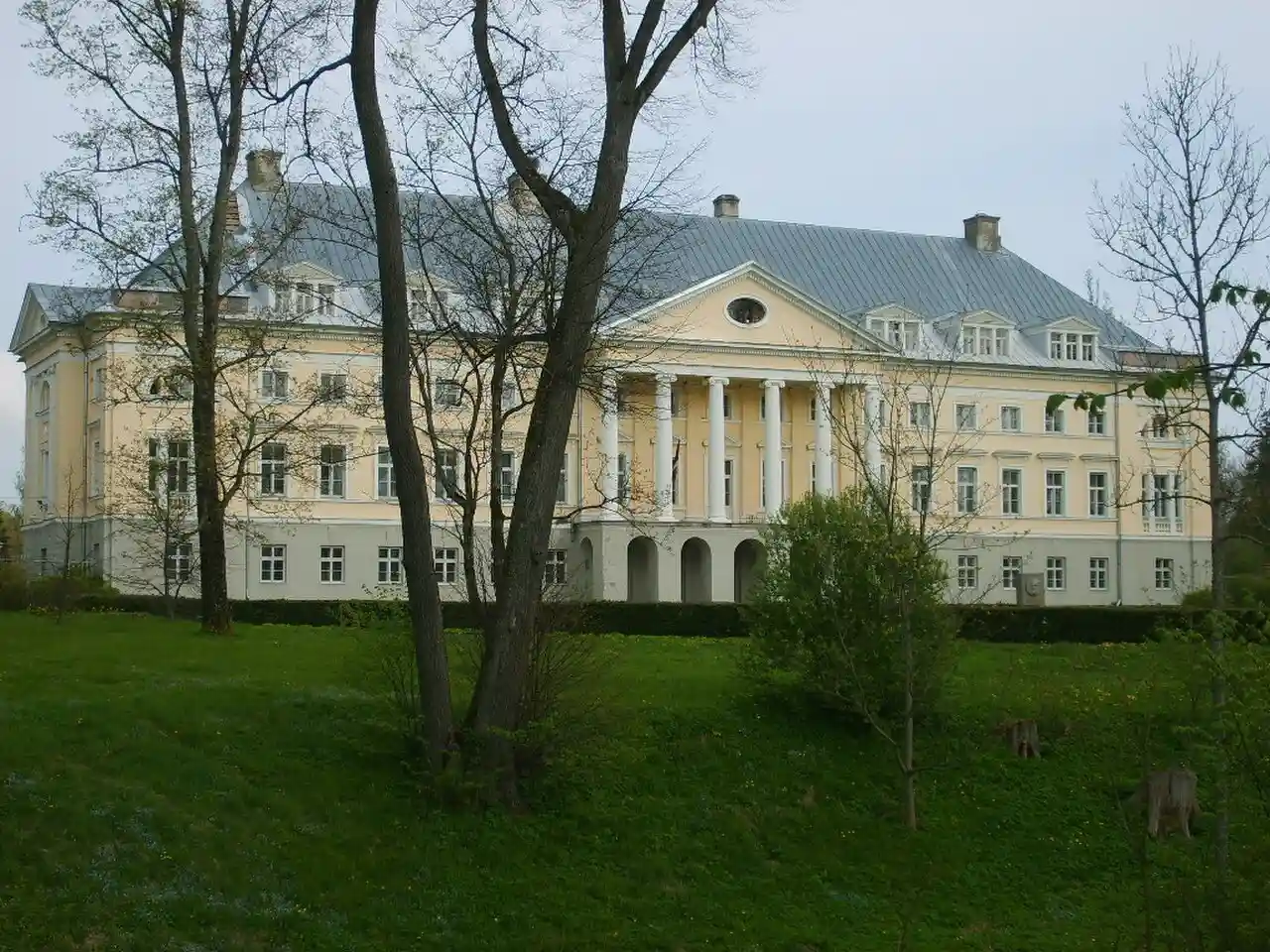 Kazdanga Palace is located in the village Kazdanga (Polish and German Katzdangen), Kazdanga Parish, South Kurzeme Municipality, Latvia. The first manor house was made out of wood and the new palace was built in 1800–1804 in the late classical style, designed according to the project by the German architect J. G. Berlitz. Kazdanga established the first Latvian fish pond, now in operation for a number of important agricultural schools. Read more on Wikipedia