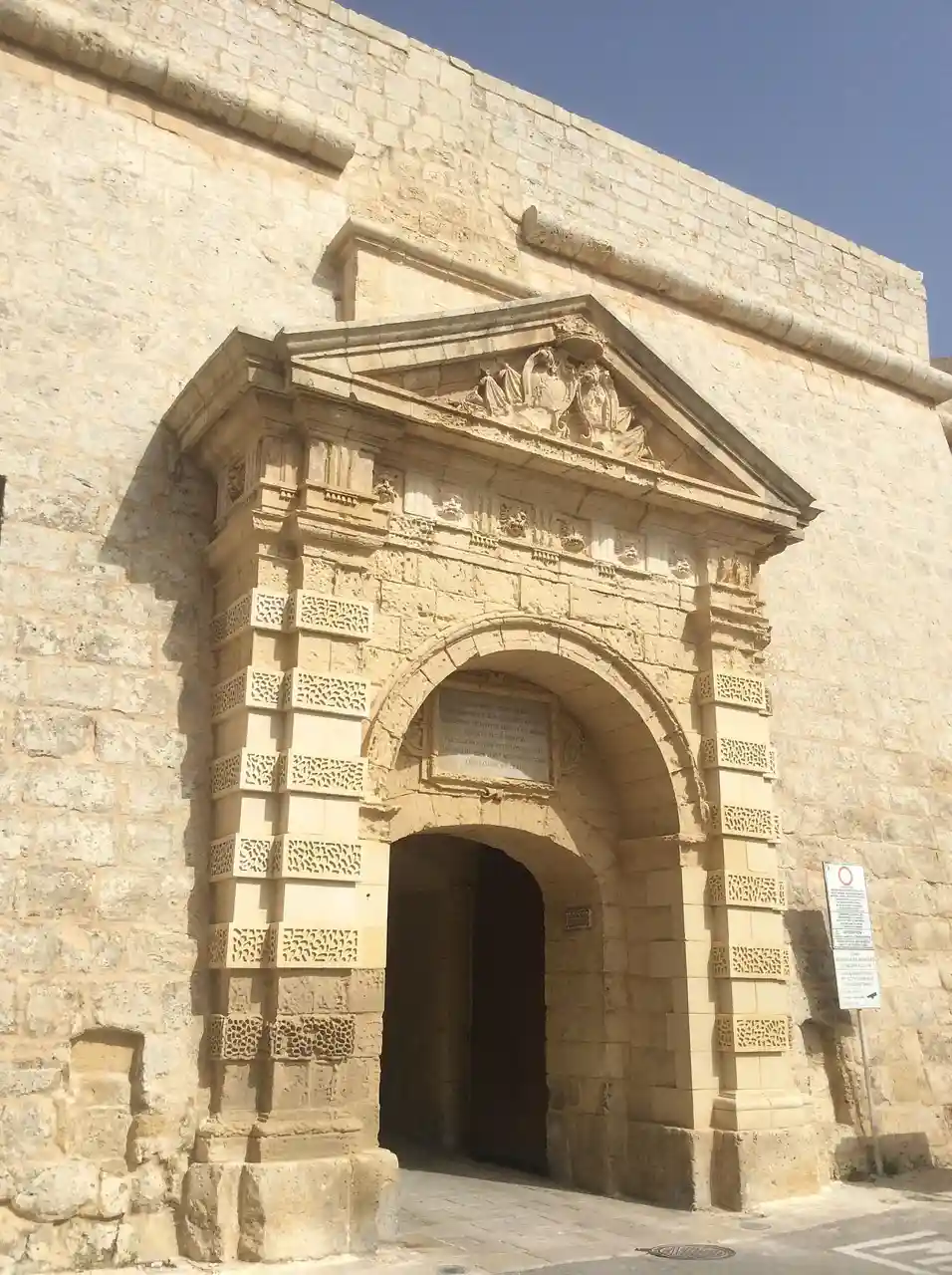 The Greeks Gate ( or ; ; ) is a gate into the fortified city of Mdina, Malta. The gate was originally built in the medieval period, and its outer portal was built in the Baroque style in 1724 by Charles François de Mondion. Despite this, the rear part of its gate retains its original form, making it one of the few visible remains of Mdina's medieval walls. Read more on Wikipedia