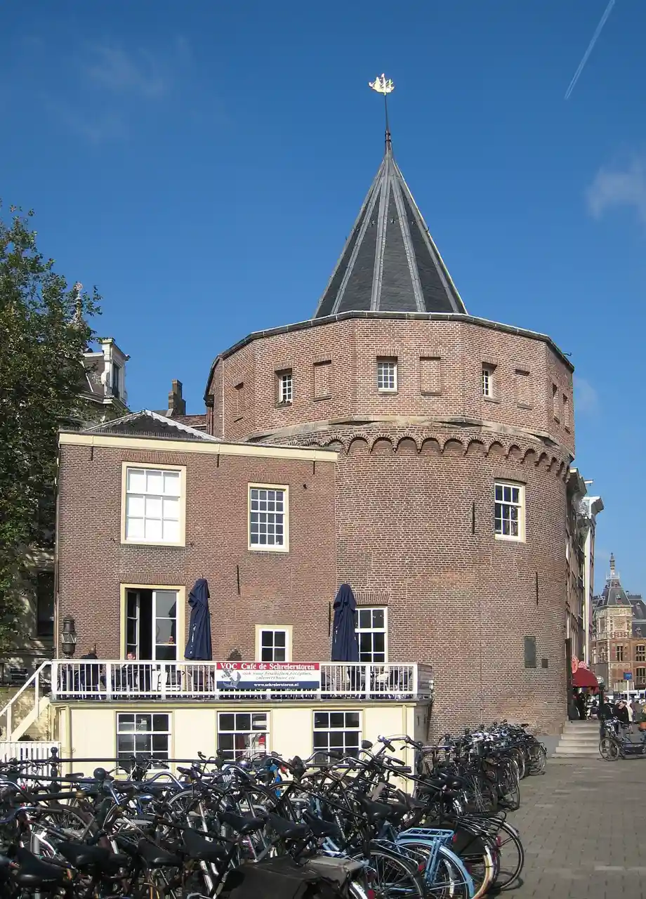 The Schreierstoren (English incorrectly translated as: Weeper's Tower or Tower of Tears), originally part of the medieval city wall of Amsterdam, the Netherlands, was built in the 15th century. It is located at the Prins Hendrikkade 94 in the city center of Amsterdam. It was the location from which Henry Hudson set sail on his journey to Northern America. This expedition would lead to the discovery of the modern New York metropolitan area, which laid the foundation for Dutch colonization of the region. It was built as a defense tower in 1487. It is currently a café and nautical bookstore. Read more on Wikipedia