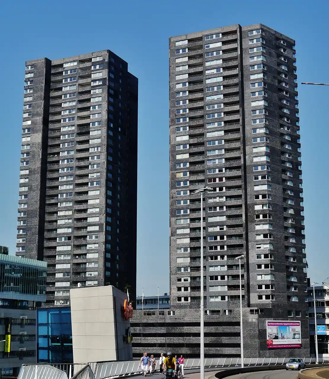 The Hoge Heren (English: High Gentlemen) is hybrid complex composed of two towers in the center of Rotterdam designed by Wiel Arets, located in the former Zalmhaven of the city near the Erasmusbrug. The building was completed in 2000. The complex is 102 meters high and has 34 floors. Read more on Wikipedia
