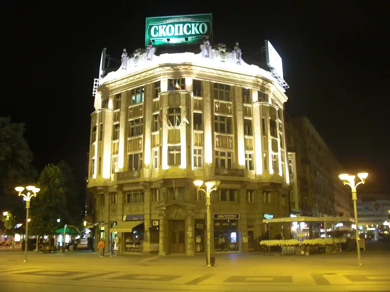 Ristić Palace (Serbian Cyrillic: Ристићева палата; Macedonian: Ристиќева палата, Ristikjeva palata) is a monumental symbolic building at Macedonia Square (with the 'СКОПСКО' sign on top meaning 'Skopsko', a popular local beer brand) in Skopje, North Macedonia. The palace is located on the southern side of the Vardar river, in the southern part of Macedonia Square to the east is the birthplace of Mother Teresa, and to the south is the Memorial House of Mother Teresa and the headquarters of the Ministry of Transport and Communications of North Macedonia. It was built in 1926 and is currently used as an office block. Read more on Wikipedia