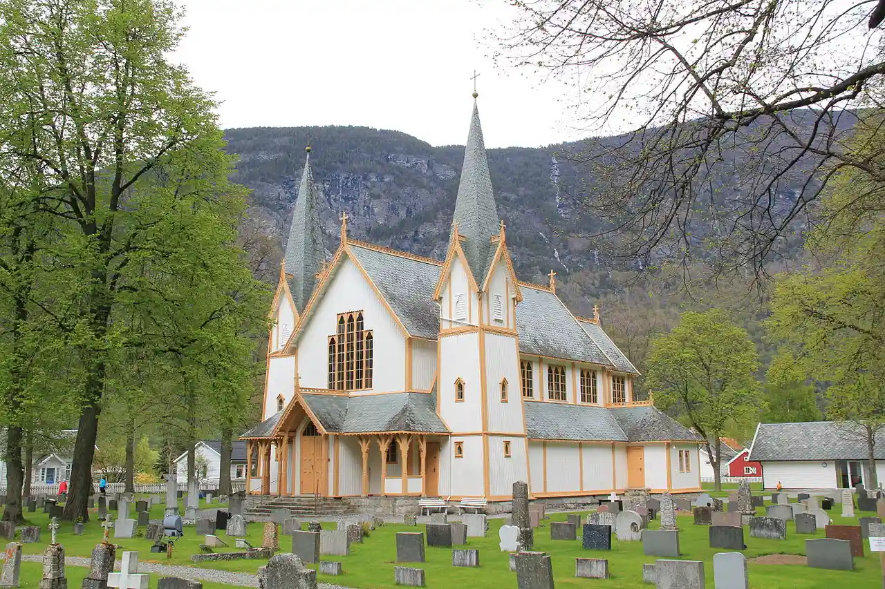 Hauge Church () is a parish church of the Church of Norway in Lærdal Municipality in Vestland county, Norway. It is located in the village of Lærdalsøyri. It is the church for the Hauge parish which is part of the Sogn prosti (deanery) in the Diocese of Bjørgvin. The wooden church is painted white with brownish-yellow trim. It was built in a long church design in 1869 using plans drawn up by the architect Christian Christie. The church seats about 500 people. Read more on Wikipedia