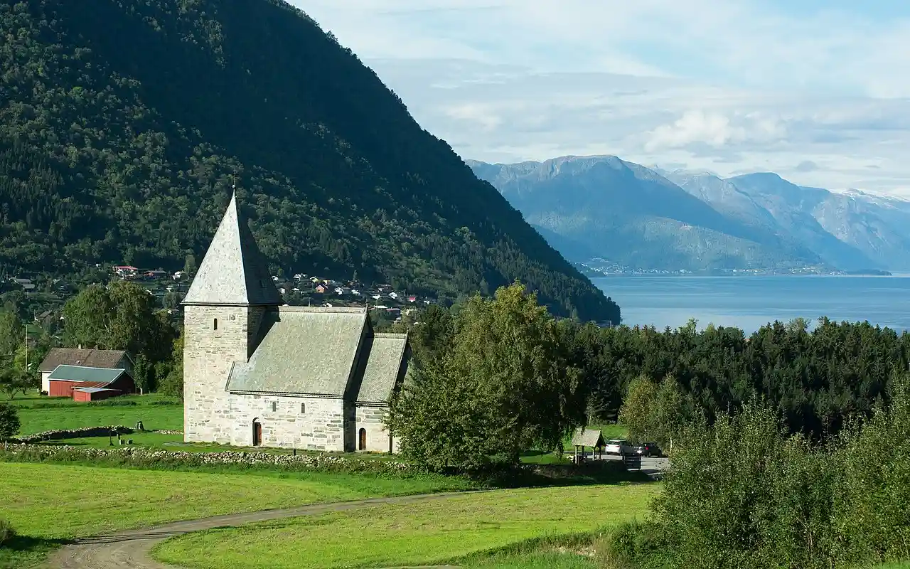 Hove Church () is a historic parish church of the Church of Norway in Vik Municipality in Vestland county, Norway. It is located in the village of Vikøyri on the Arnafjord, an arm of the Sognefjord. It was historically the main church for Hove parish in the Diocese of Bjørgvin. The gray, stone church was built in a long church design in a Romanesque style around the year 1170 using plans drawn up by unknown architect. Since about 2016 the church has been the base for the Hove Church Music Festival (Hove kyrkjemusikkfestival) run by local cultural personality, Jens Brekke, and an American early music chamber choir. The church seats about 35 people. Read more on Wikipedia