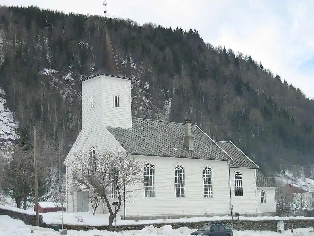 Oppheim Church () is a parish church of the Church of Norway in Voss Municipality in Vestland county, Norway. It is located in the village of Oppheim, located on the northern shore of the lake Oppheimsvatnet. It is the church for the Oppheim parish which is part of the Hardanger og Voss prosti (deanery) in the Diocese of Bjørgvin. The white, wooden church was built in a long church design in 1871 using plans drawn up by the architect Ole Vangberg. The church seats about 250 people. Read more on Wikipedia