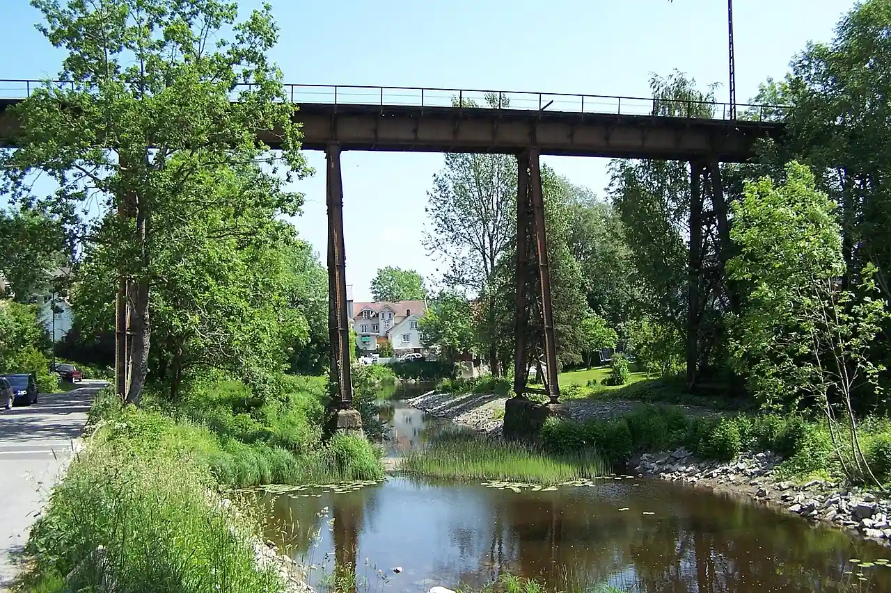The Hølen Viaduct () is a disused iron railway viaduct situated at Hølen in Viken county, Norway. The iron carried a single track of the Østfold Line over the river Såna and the valley where the village of Hølen is located. The viaduct was the first pendulum pillar bridge in the world, and was designed by the principle's inventor, Axel Jacob Petersson. It is long. Read more on Wikipedia