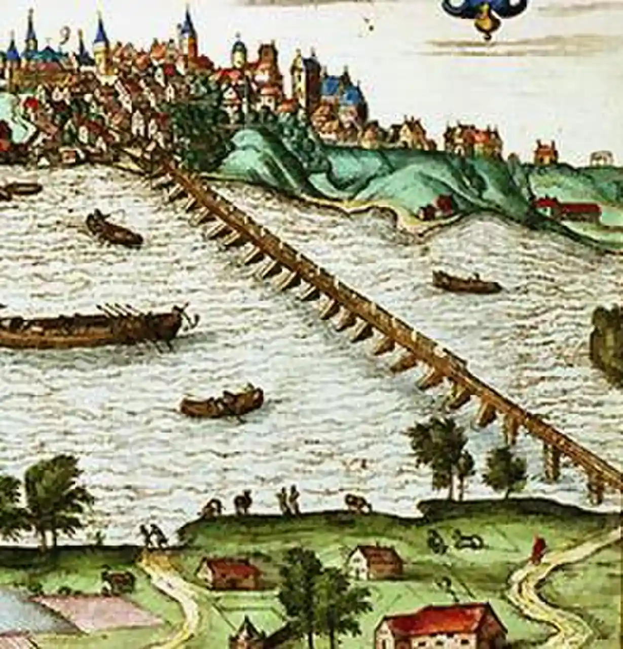 The Sigismund Augustus Bridge () was a timber bridge over the Vistula River in Warsaw which came into operation in 1573 and lasted for 30 years. It was the first permanent crossing over the Vistula River in Warsaw and the longest wooden crossing in Europe at the time at 500 meters in length. The bridge was one of the greatest engineering works of the Renaissance in Poland and one of the largest in Europe. Read more on Wikipedia