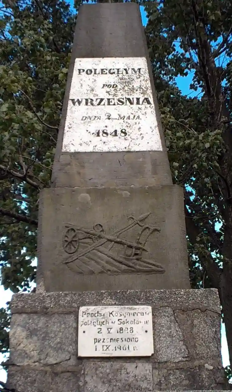 Monument of Sokołowo - a monument commemorating the victims of the Battle of Sokołowo on May 2, 1848 during the Greater Poland Uprising. In the battle the forces of the Prussian led by Gen. A. Hirschfeld were against the Polish insurgents who were helped by local peasants and their leader was Ludwik Mierosławski. The victorious battle more than 300 insurgents were killed. This event also marks the Song of 1848. The monument was built according to Cyprian Norwid's idea. Read more on Wikipedia