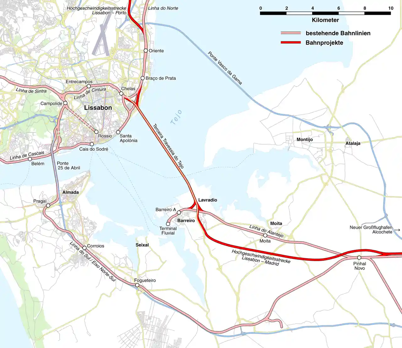 The Third Tagus Crossing (commonly abbreviated as TTT) is a project for a road-rail crossing over the Tagus River, with the aim of connecting the city of Lisbon, on the north bank, to the peninsula of Setúbal on the south bank. It is part of the construction of the new Lisbon-Madrid and Lisbon-Seville high-speed railway line ("RAVE"). Read more on Wikipedia