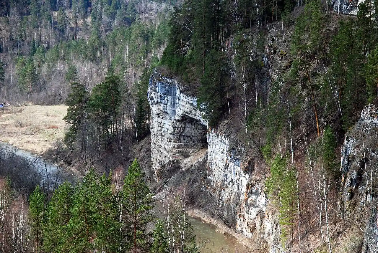 Ignatievka Cave (Ignateva cave, Ignatievskaya cave, , also known as Yamazy-Tash) is a large limestone cave on the banks of the Sim River, a tributary of the Belaya river in the southern Ural Mountains of Russia.. In 1980 a parietal wall painting of a female figure was discovered. The twenty-eight red dots between her legs are believed to represent the female menstrual cycle... Read more on Wikipedia