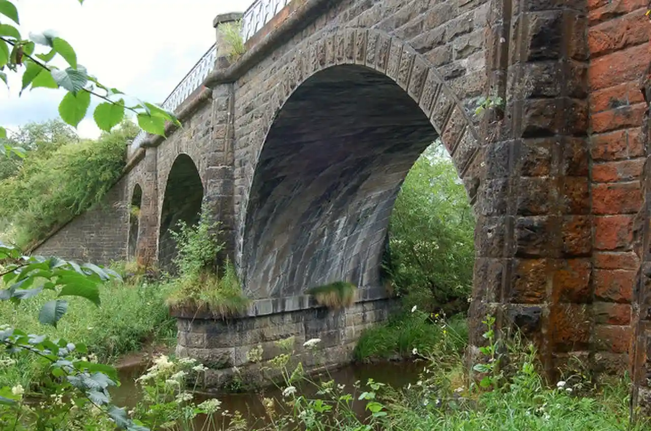 Lyne Viaduct is a viaduct at Lyne in the Scottish Borders of Scotland. It consists of three stone skew arches and a plate girder approach span over a minor road and was built to carry the Symington to Peebles branch line of the Caledonian Railway over Lyne Water to the west of Peebles. Now closed to rail traffic the bridge is used as a footpath. Read more on Wikipedia