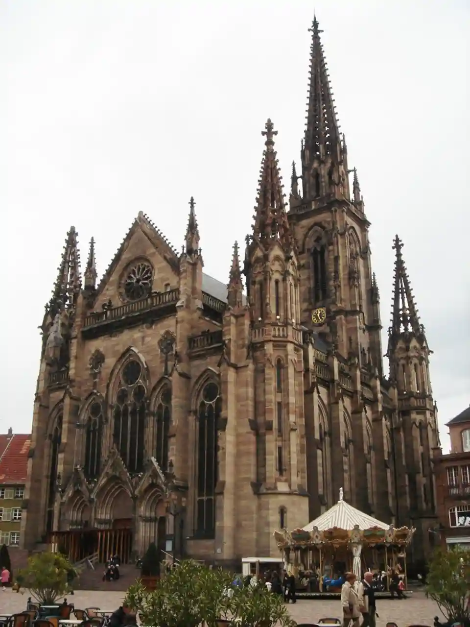 The Temple Saint-Étienne (Protestant St. Stephen's Church; Alsatian: Schtefànskerch) is a Calvinist church located in the city of Mulhouse, Alsace, France. Its congregation forms part of the Protestant Reformed Church of Alsace and Lorraine. Because of its central location on the main square of Mulhouse, the Place de la Réunion, and its 97 metre high bell tower (the highest steeple in the department of Haut-Rhin), it is sometimes referred to as the "Cathedral of Mulhouse" (Cathédrale de Mulhouse). The church was designed by the city architect Jean-Baptiste Schacre, who also designed the large Catholic St. Stephen's Church (Église Saint-Étienne). Read more on Wikipedia