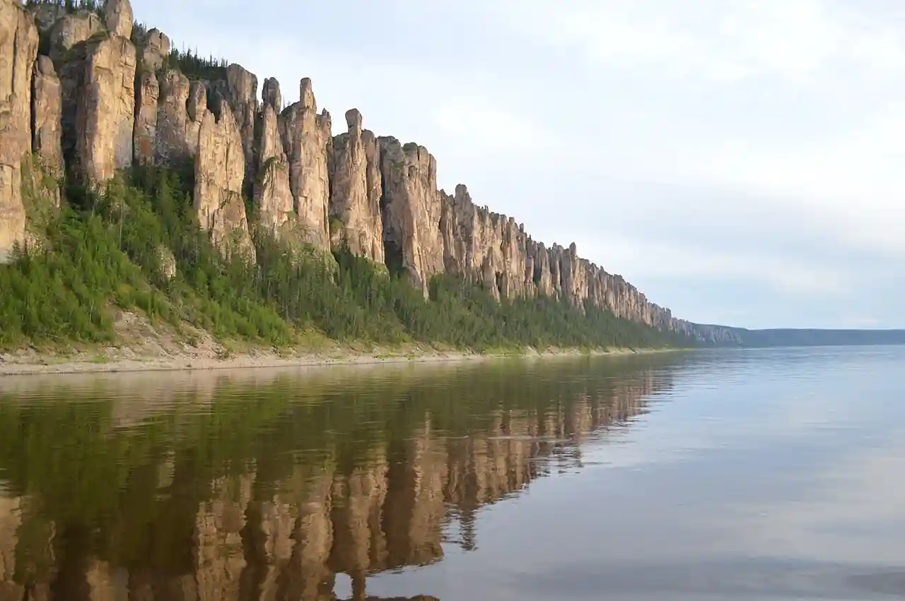 The Lena Pillars (; , Ölüöne Turūk Khayalara) are a natural rock formation along the banks of the Lena River in far eastern Siberia. The pillars are high, and were formed in some of the Cambrian period sea-basins. The highest density of pillars is reached between the villages of Petrovskoye and Tit-Ary. The Lena Pillars Nature Park was inscribed on the World Heritage List in 2012. Read more on Wikipedia