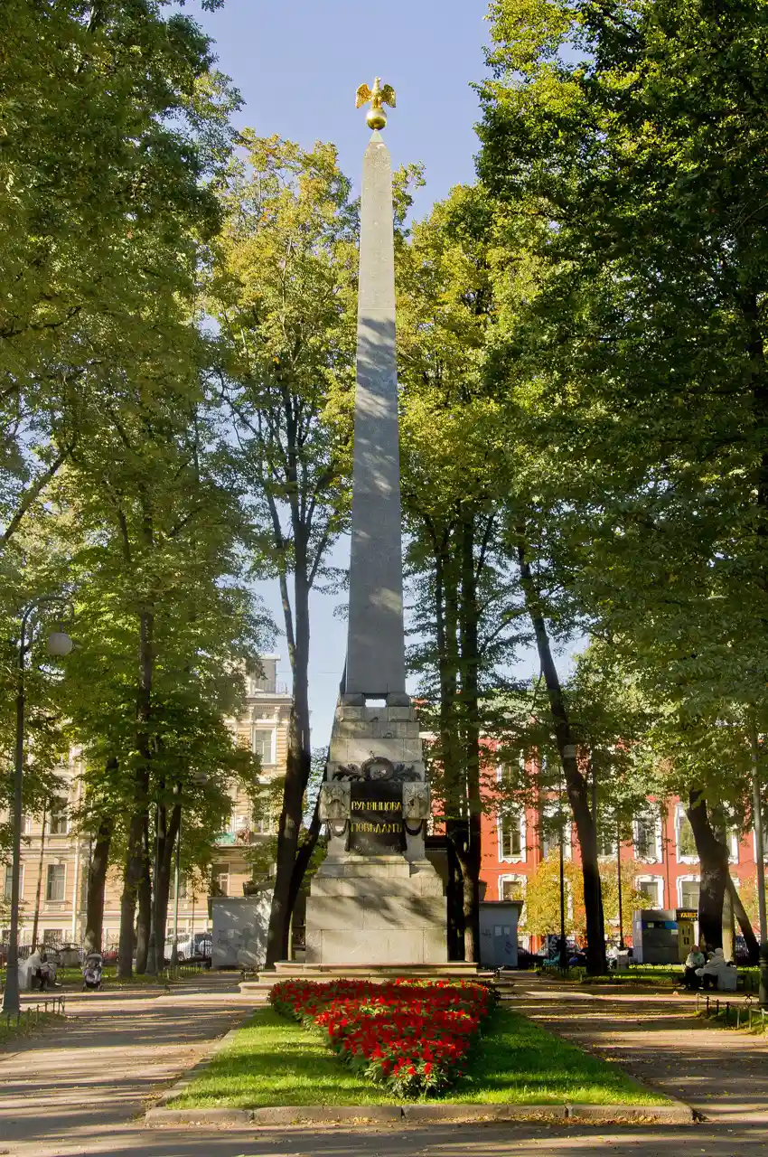 The Rumyantsev Obelisk () is a granite obelisk located in Saint Petersburg. It is at the centre of , on Vasilyevsky Island, between the Menshikov Palace and the Saint Petersburg Institute for Painting, Sculpture and Architecture. The obelisk commemorates the victories of Count Pyotr Rumyantsev during the Russo-Turkish War between 1768 and 1774, and his service in the Russo-Turkish War of 1787–1792. Read more on Wikipedia