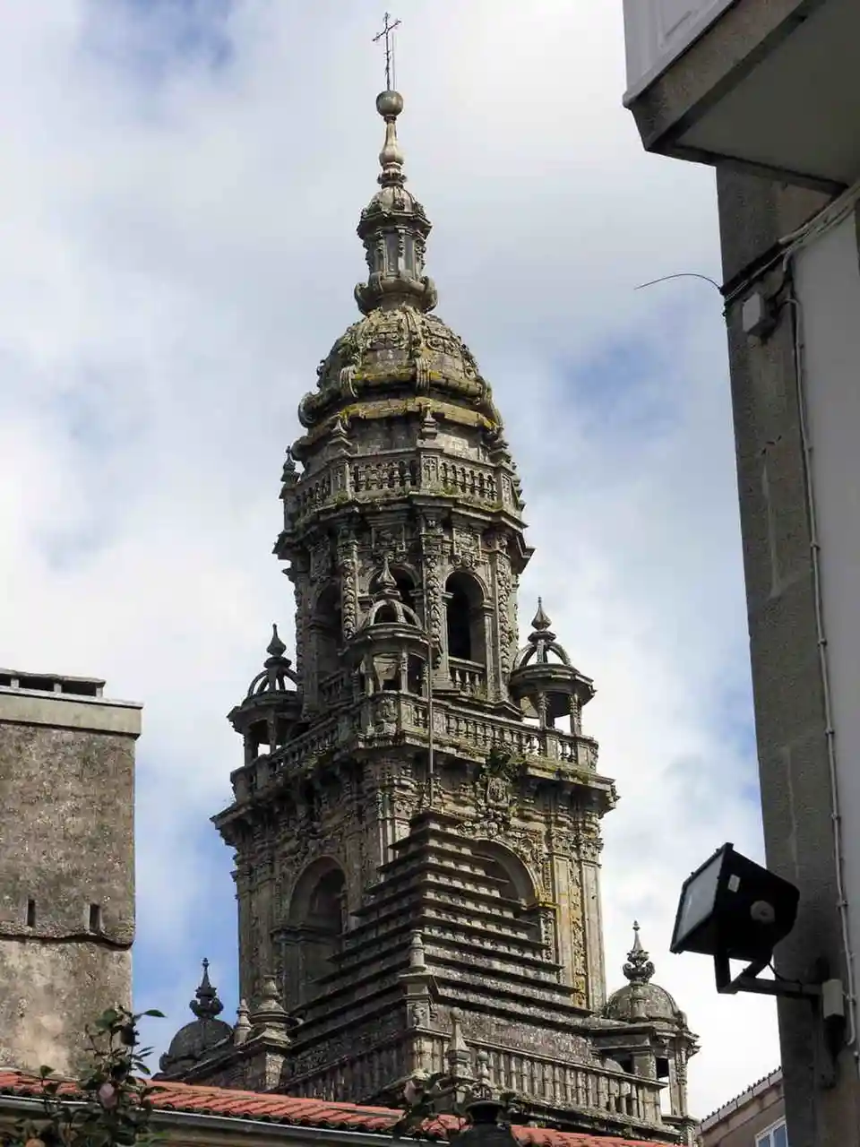 The Berenguela Tower ( or , ), is the bell tower of the Santiago de Compostela Cathedral in Santiago de Compostela, Spain. Tradition states that it was built by Archbishop Rodrigo del Padrón as a defense tower with the work continuing after his death by his successor, Archbishop Bérenger de Landore, after whom the tower is named. Reflecting its original purpose, much of the tower is made of ashlar stone. The tower sits on the southeast side of the cathedral where the and Quintana Square meet. The tower is visible throughout the city. Read more on Wikipedia