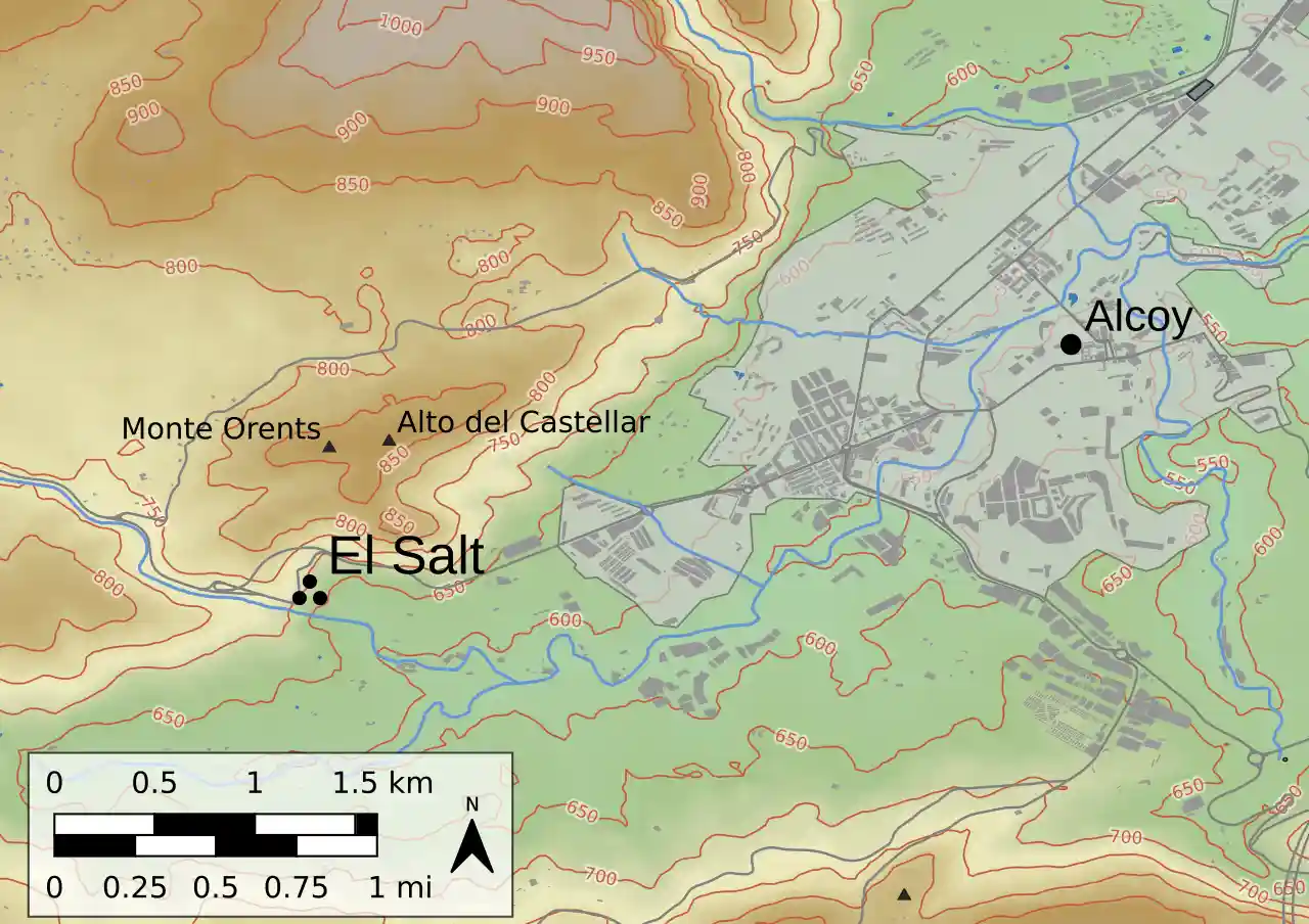El Salt is an archaeological site from the Middle Paleolithic near Alcoy, in the Spanish Province of Alicante, which was frequented by groups of archaic humans for thousands of years. Scientists have found evidence of Neanderthal settlements, including fire pits and flint tools, dating back at least 50,000 years, including six teeth; they disappeared from the site and possibly the Iberian peninsula some 45,000 years ago. In 2014, the then-oldest known human coprolites were discovered at the site, which revealed that Neanderthals' diets included plants. Read more on Wikipedia