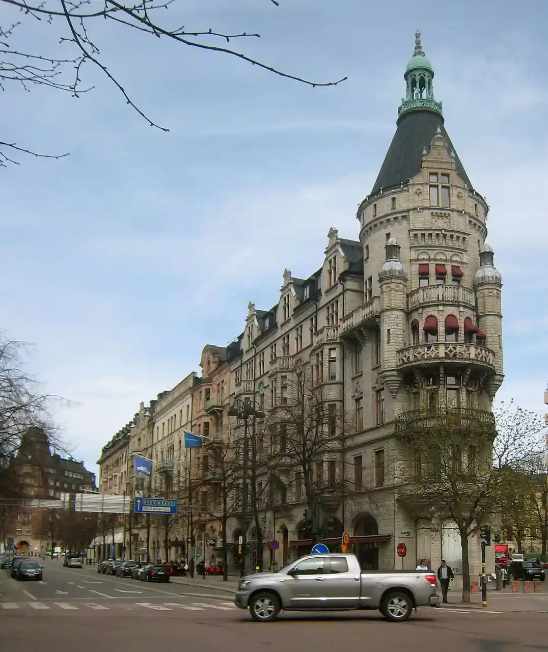 The Daneliuska huset ("Danelius Building") is a structure in the Landbyska verket neighborhood of Stockholm, Sweden. It is sometimes called the Strykjärnshuset (Flatiron Building) because it sits on a wedge-shaped plot between Birger Jarlsgatan, Biblioteksgatan, and Stureplan, in the Östermalm district in the city center.Hasselblad, Björn; Lindström, Frans (1979). Stockholmskvarter: vad kvartersnamnen berättar. Stockholm: AWE/Geber. p. 173. The building is recognizable by its steeply-pitched conical tower and its richly decorated limestone facade in an early French Renaissance style. The building is blue-marked by the City Museum of Stockholm, which means that it represents "extremely high cultural-historical values."Stockholm Stadsmuseets (City Museum)'s interactive map for cultural marking of buildings in Stockholm. Read more on Wikipedia