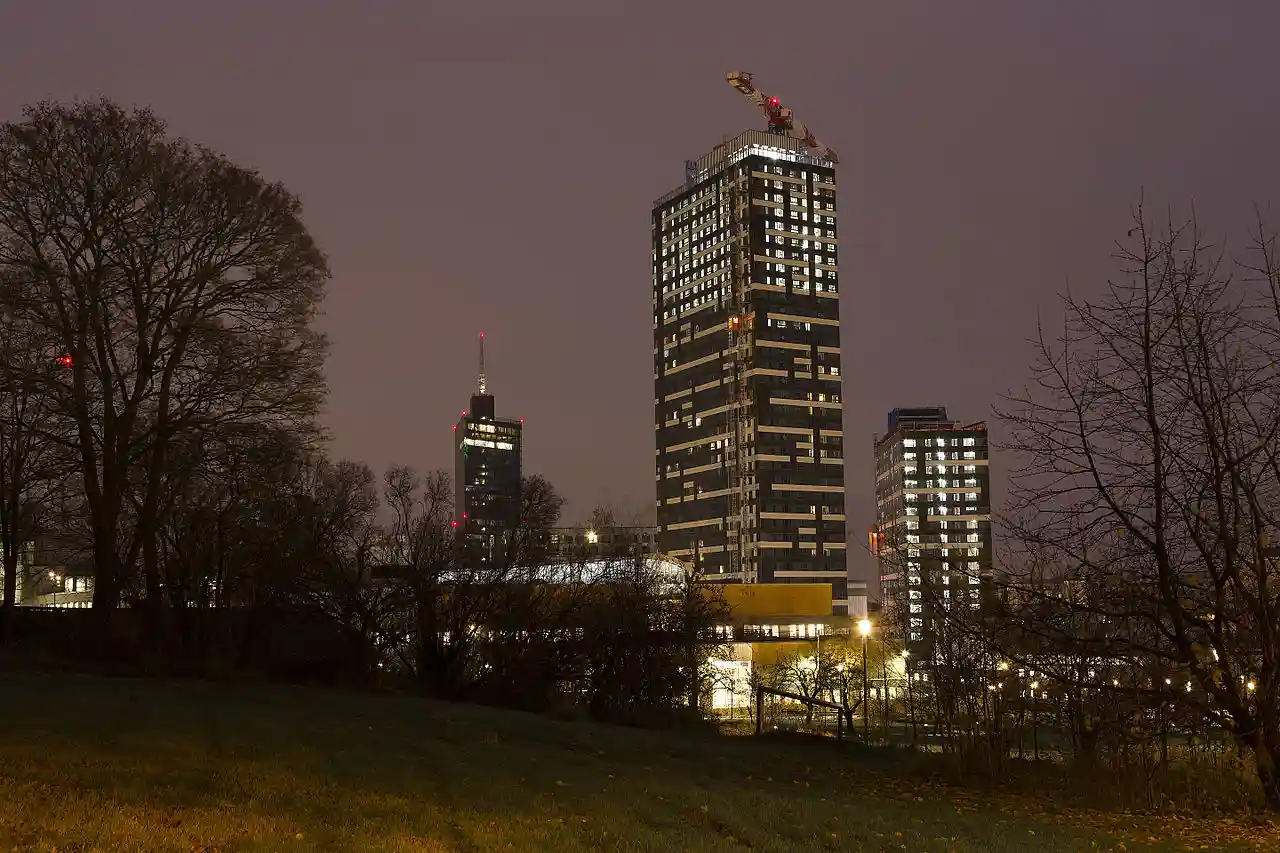 Kista Torn (in English, Kista Towers) is a pair of 19- and 40-storey apartment buildings, connected at their base. The towers are situated on Borgarfjordsgatan in the Kista district of Stockholm, Sweden. The highest tower ("K1") stands at tall, which made it the tallest residential skyscraper in Stockholm on its completion in 2015. This feat is set to be matched by Norra Tornen in Hagastaden, upon completion of that project. Read more on Wikipedia