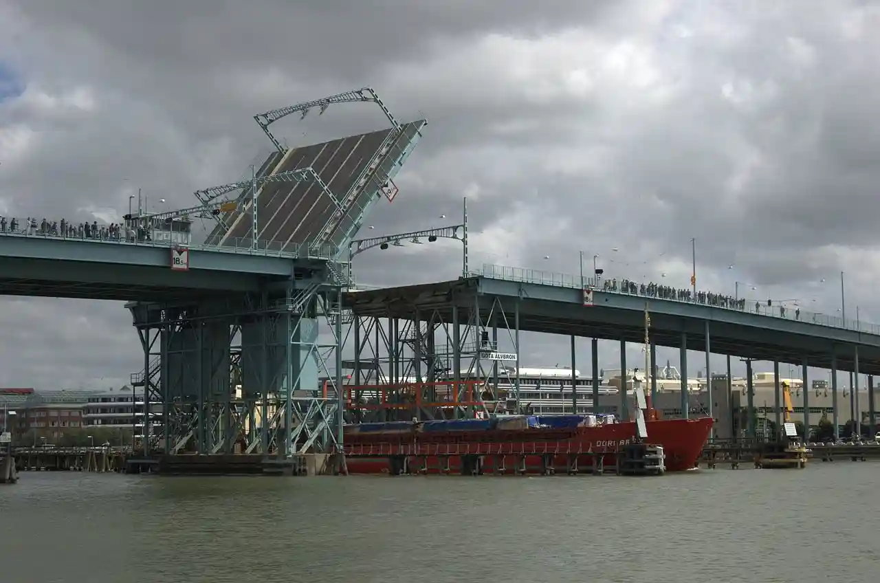 Götaälvbron (Göta älv Bridge) was a bascule bridge in central Gothenburg, Sweden, carrying normal road vehicles and trams. The bridge was constructed in 1937 to 1939 and in 1966 it was widened. It was closed for decommissioning in June 2021. Constructed of steel beam, the bridge had a total length of and width of . The mid span had a free height of . Read more on Wikipedia