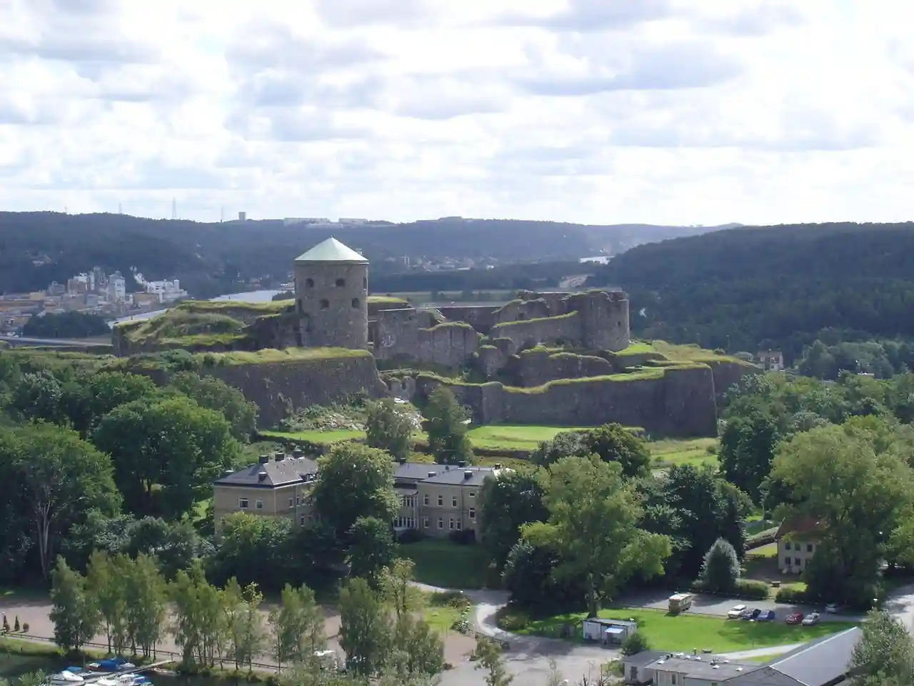 Bohus Fortress (also known as Baahus or Båhus, originally: Bágahús) lies along the old Norwegian–Swedish border in Kungälv, Bohuslän, Sweden, north east from Hisingen where the Göta river splits into two branches ( north of Gothenburg). It commands the surrounding area from a cliff high, with the river forming a natural moat around it. Read more on Wikipedia