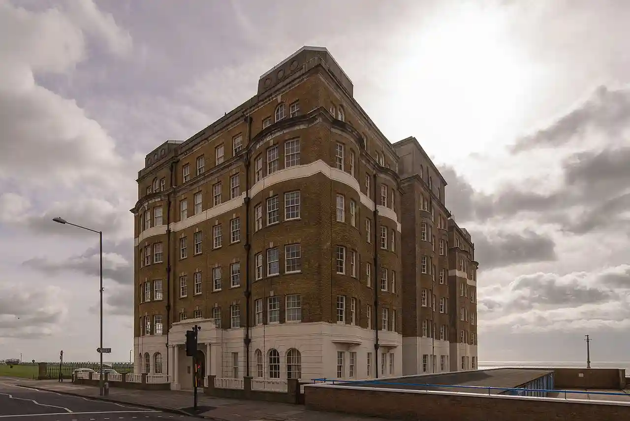 Courtenay Gate is a block of serviced apartments on the seafront in Hove, part of the English coastal city of Brighton and Hove. Situated in a prominent position next to the beach and overlooking Hove Lawns, the six-storey block is Neo-Georgian in style and dates from 1934. It is in a conservation area and is a locally listed building. Built to replace a terrace of early-19th-century houses which had been demolished more than 30 years earlier, the "imposing" gault brick building has a "palatial" appearance and is a landmark on the seafront. Read more on Wikipedia