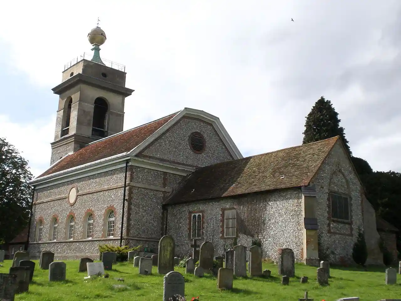 St Lawrence's Church is a Church of England church in the parish of West Wycombe, Buckinghamshire, England. It sits on top of West Wycombe Hill in a prominent position overlooking the West Wycombe Road, and surrounding villages. West Wycombe Hill is managed by the National Trust, although the church and graveyard are owned by the Church of England. The church resides in the Chilterns Area of Outstanding Natural Beauty. St Lawrence Church and the mausoleum both occupy similar positions on top of West Wycombe Hill, and the Church tower is visible for many miles around. The top of the tower is the highest point in the Southern Chilterns and on a clear day, it is possible to see West London. Read more on Wikipedia
