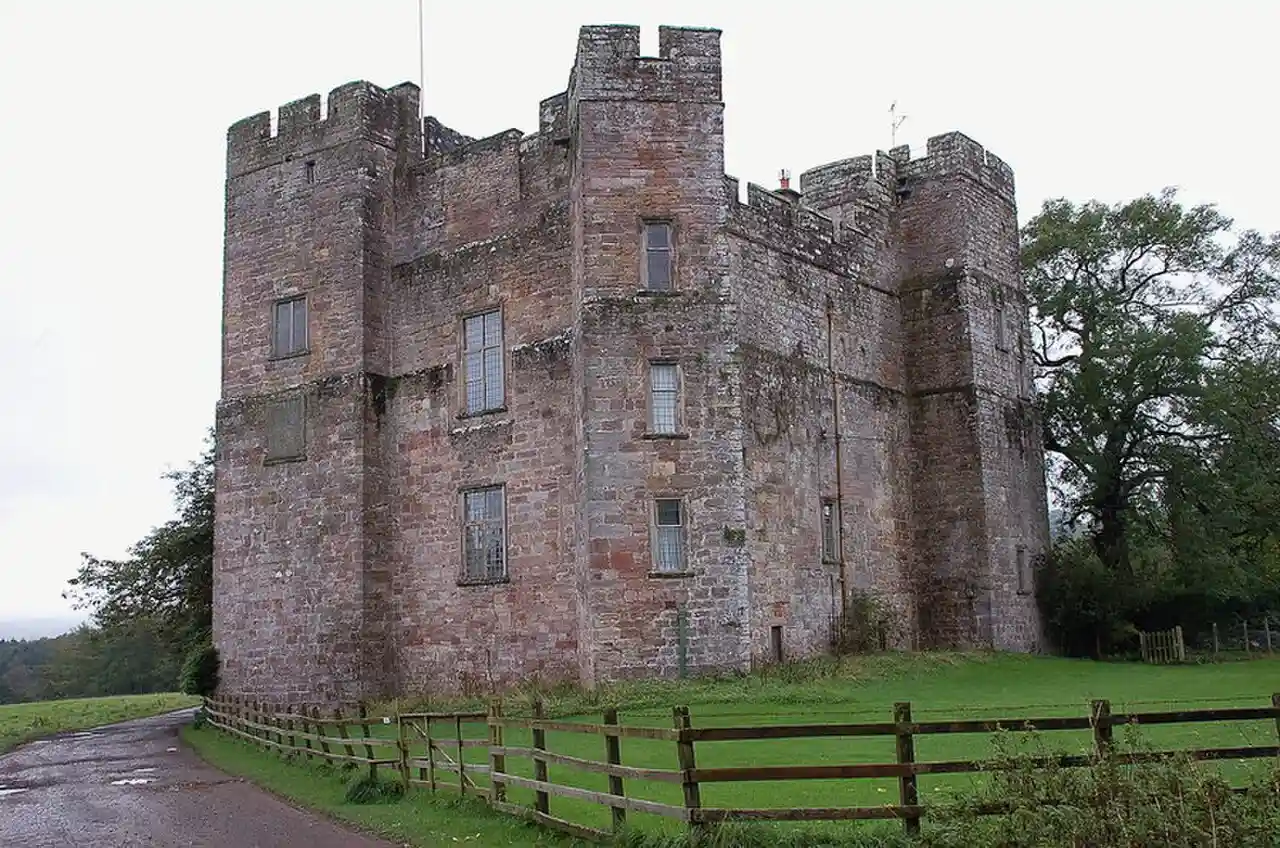 Dacre Castle is a moated tower house in the village of Dacre, south-west of Penrith, Cumbria, England. It was constructed in the mid-14th century, probably by Margaret Multon, against the background of the threat of Scottish invasion and raids, and was held in the Dacre family until the 17th century. The tower house is tall, built out of local sandstone, topped by crenellations, with four turrets protruding from a central block, and includes an ornate lavabo in the main hall. Renovated during the 1670s and 1960s after periods of disrepair, the castle is now used as a private home. Read more on Wikipedia