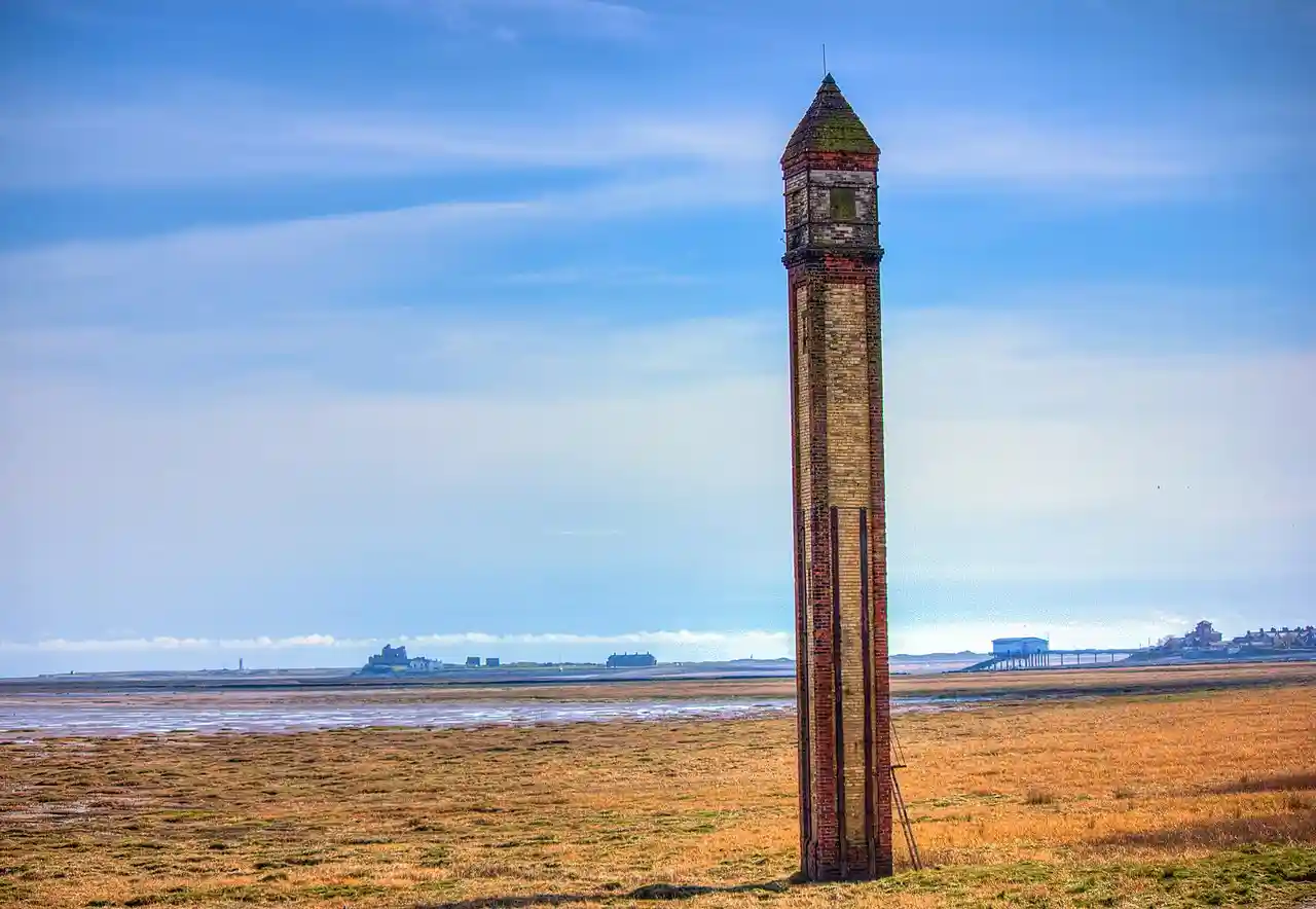 Rampside Leading Light, also known as "The Needle", is a leading light (navigation beacon) located in the Rampside area of Barrow-in-Furness, Cumbria, England. Built in 1875, it is the only surviving example of 13 such beacons built around Barrow during the late 19th century to aid vessels into the town's port. It stands tall and is constructed from red and yellow bricks. Rampside Lighthouse was designated a Grade II listed building by English Heritage in 1991. Read more on Wikipedia