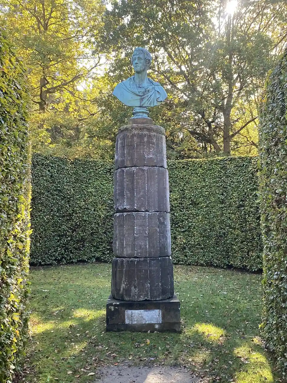The column of the Temple of Poseidon is one of the surviving features from the period of the sixth Duke of Devonshire in the Chatsworth House garden. Surmounted by an over life-sized bronze bust of the sixth Duke, the classical Greek column composed of four Doric marble drums was erected in 1840s. It is located at the south termination of the Serpentine Hedge, by the midpoint of a footpath linking between the Maze and the south end of the Broadwalk. The object has been Grade II registered since 1987. Read more on Wikipedia