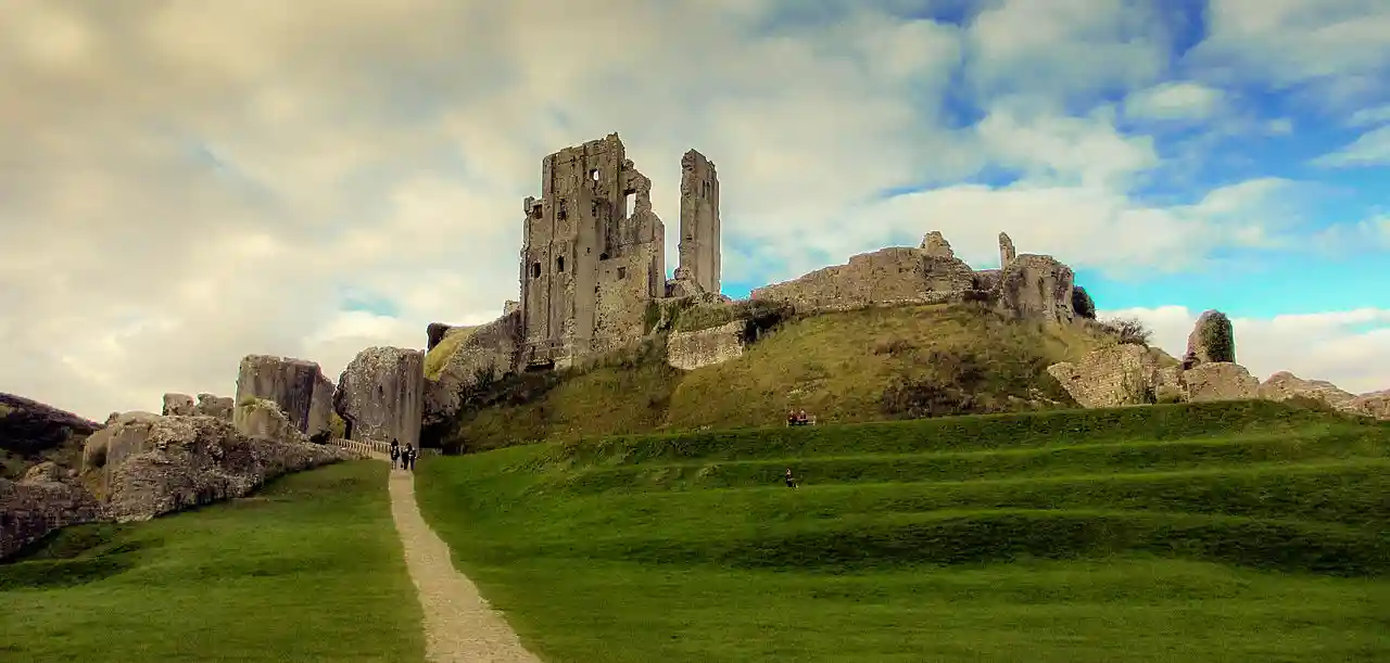 Corfe Castle is a fortification standing above the village of the same name on the Isle of Purbeck peninsula in the English county of Dorset. Built by William the Conqueror, the castle dates to the 11th century and commands a gap in the Purbeck Hills on the route between Wareham and Swanage. The first phase was one of the earliest castles in England to be built at least partly using stone when the majority were built with earth and timber. Corfe Castle underwent major structural changes in the 12th and 13th centuries. Read more on Wikipedia