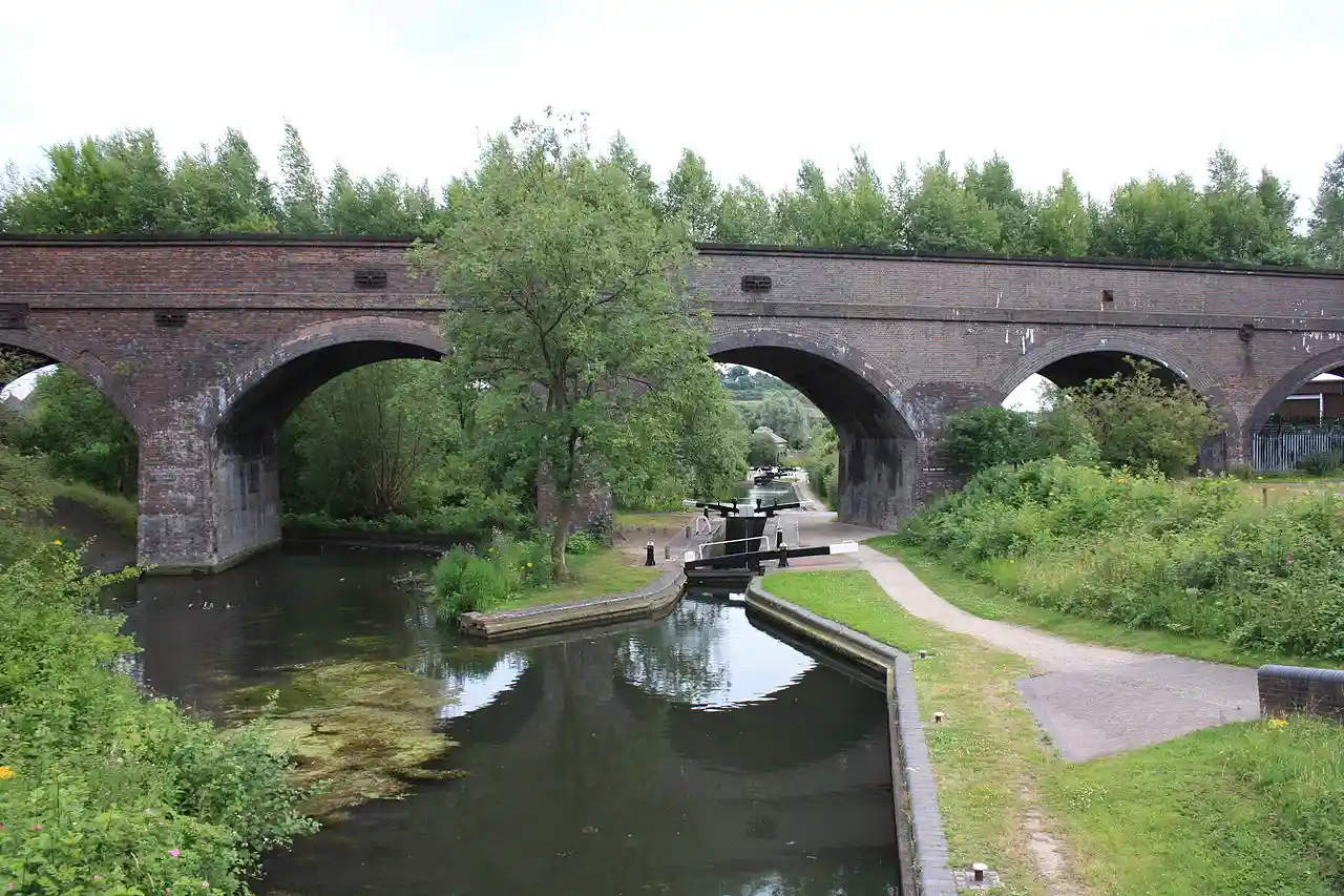 Parkhead Viaduct is a railway viaduct in Dudley, West Midlands, England. The original viaduct was a wooden structure erected in 1850 to carry the Oxford, Worcester and Wolverhampton Railway over Parkhead Locks on the Dudley Canal, near to the southern mouth of the Dudley Tunnel. The current brick viaduct was built in 1880 and it is believed that the original wooden structure is still encased within its successor. Read more on Wikipedia