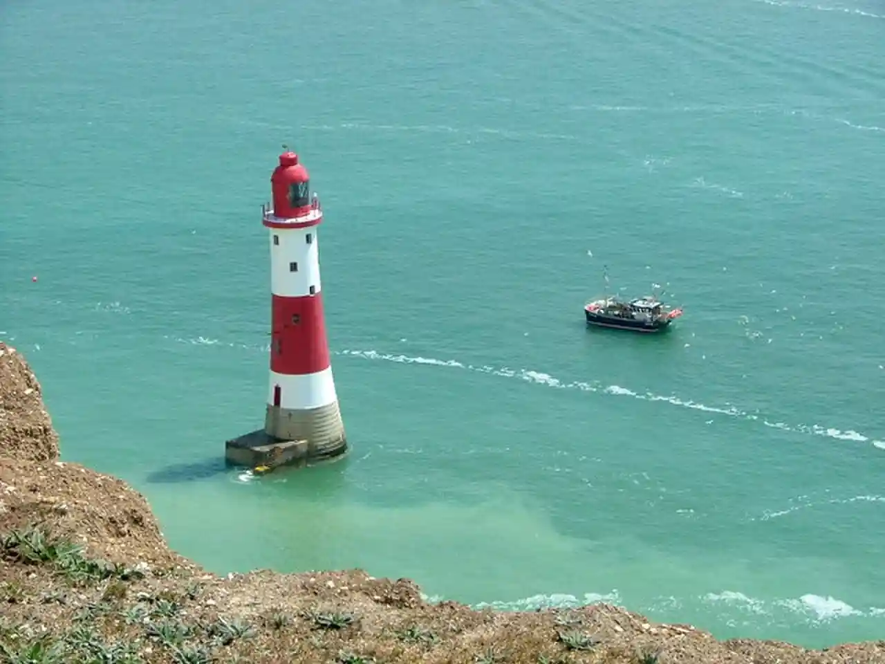 Beachy Head Lighthouse is a lighthouse located in the English Channel below the cliffs of Beachy Head in East Sussex. It is in height and became operational in October 1902. It was the last traditional-style 'rock tower' (i.e. offshore lighthouse) to be built by Trinity House. Read more on Wikipedia