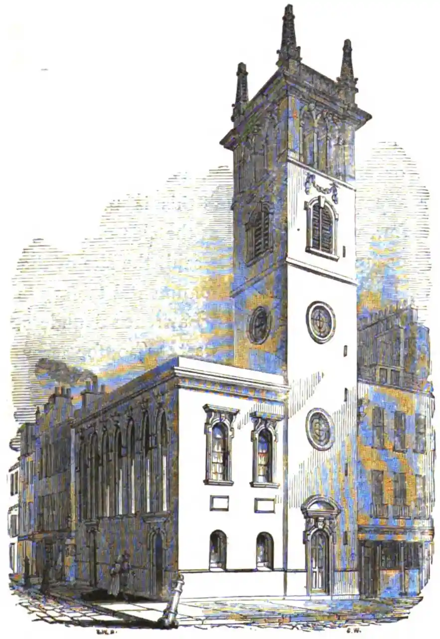 All Hallows Bread Street was a parish church in the Bread Street ward of the City of London, England. It stood on the east side of Bread Street, on the corner with Watling Street. First mentioned in the 13th century, the church was destroyed in the Great Fire of London in 1666. The church was rebuilt by the office of Sir Christopher Wren and demolished in 1876. Read more on Wikipedia