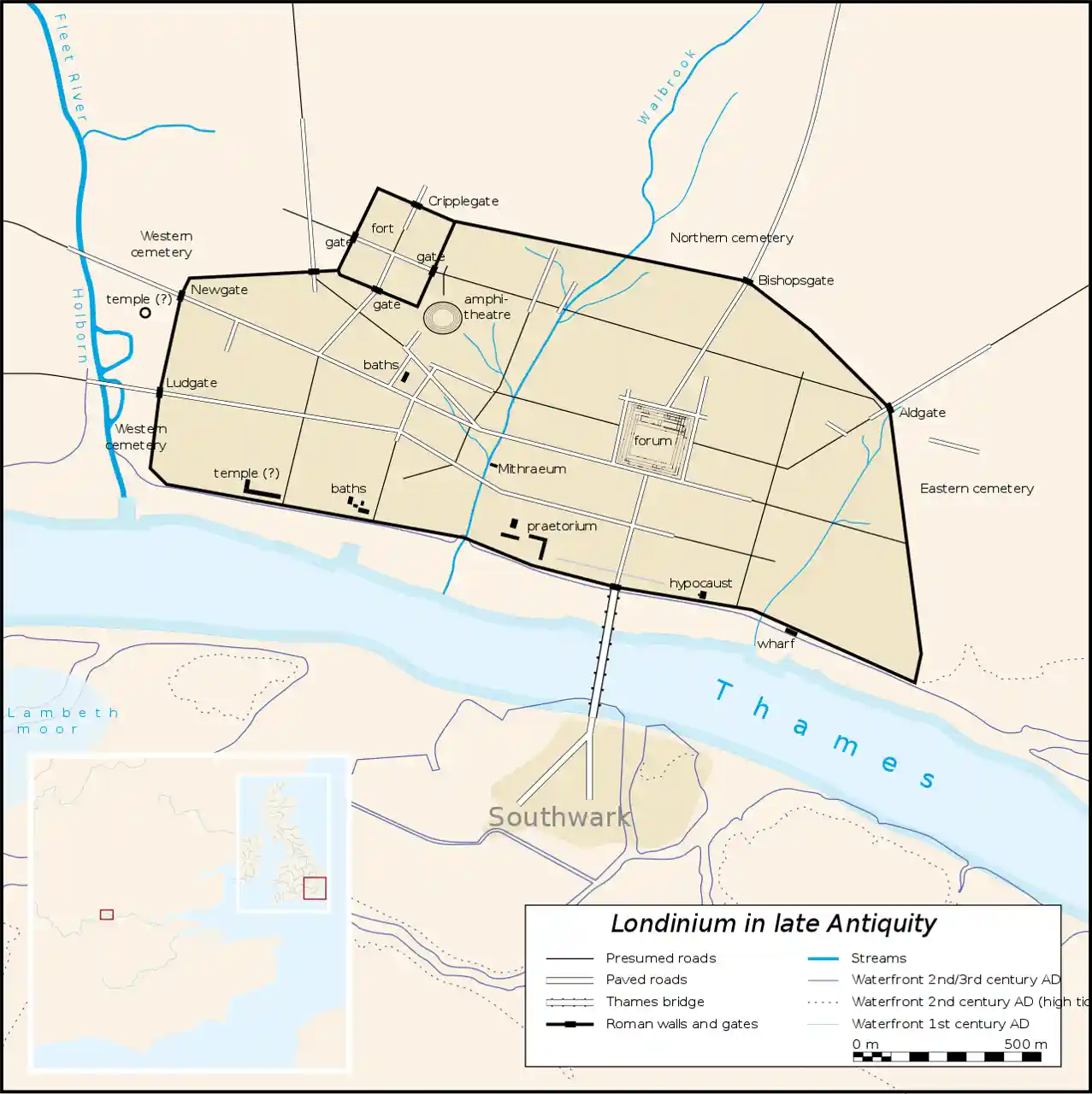 Londinium, also known as Roman London, was the capital of Roman Britain during most of the period of Roman rule. Most twenty-first century historians think that it was originally a settlement established shortly after the Claudian invasion of Britain, on the current site of the City of London around 47–50 AD, but some defend an older view that the city originated in a defensive enclosure constructed during the Claudian invasion in 43 AD.Perring, London in the Roman World, pp. 51-63 Its earliest securely-dated structure is a timber drain of 47 AD.Number 1 Poultry (ONE 94), Museum of London Archaeology, 2013. Archaeology Data Service, The University of York. It sat at a key ford at the River Thames which turned the city into a road nexus and major port (which was built between 49 and 52 AD), serving as a major commercial centre in Roman Britain until its abandonment during the 5th century. Read more on Wikipedia