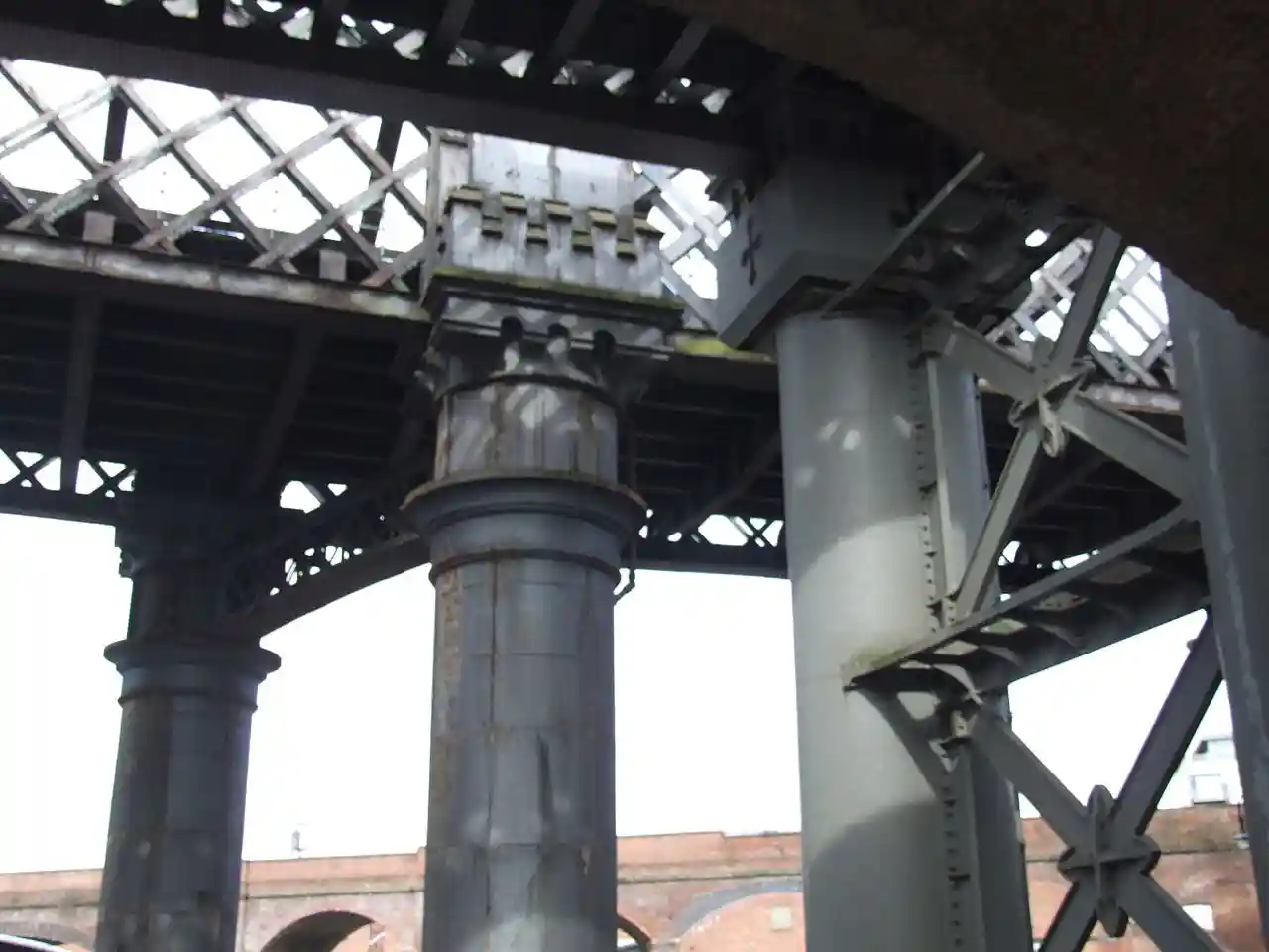 Castlefield Viaduct is a disused railway viaduct built in 1892, which used to carry heavy rail traffic in and out of the Great Northern Warehouse, located in the Castlefield area of Manchester, England. It closed in 1969 and stood unused, though has been regularly maintained by National Highways. Read more on Wikipedia
