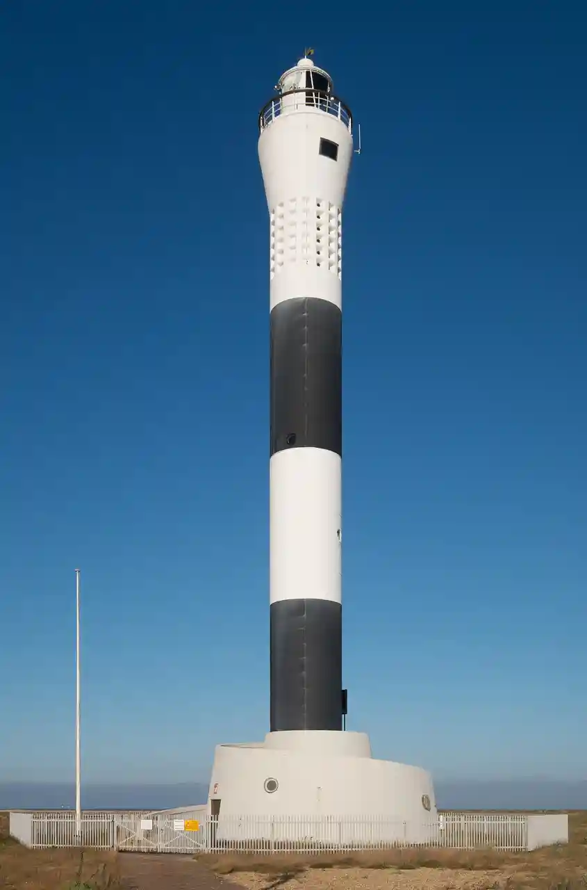 Dungeness Lighthouse on the Dungeness Headland started operation on 20 November 1961. Its construction was prompted by the building of Dungeness nuclear power station, which obscured the light of its predecessor (dating from 1904) which, though decommissioned, remains standing. The new lighthouse (the fifth on the site) is constructed of precast concrete rings; its pattern of black and white bands is impregnated into the concrete. It remains in use today, monitored and controlled from the Trinity House Operations and Planning Centre at Harwich, Essex. Read more on Wikipedia