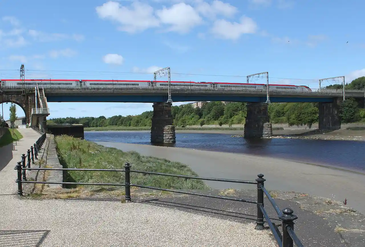 The Carlisle Bridge is the main railway bridge crossing the River Lune at Lancaster, Lancashire, England, carrying the West Coast Main Line over three spans. This section of the railway, including the original version of the bridge, was the work of Thomas Brassey, William Mackenzie, and John Stephenson; it was built between 1844 and 1846 and opened in 1847. There is a walkway for public use attached to the east side of the bridge. Read more on Wikipedia