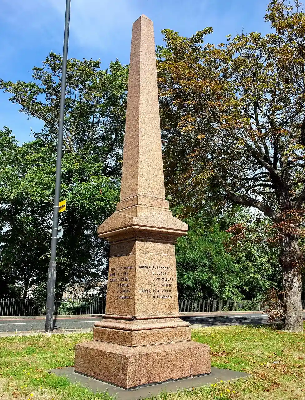 The Boer War Memorial in Woolwich is opposite the Royal Artillery Barracks on Grand Depot Road in Woolwich. The memorial marks the deaths of the 18 soldiers of the 61st Battery Royal Field Artillery who died in the Second Boer War. The memorial is a tall thin pink granite obelisk on a square plinth with a three-step base. Read more on Wikipedia