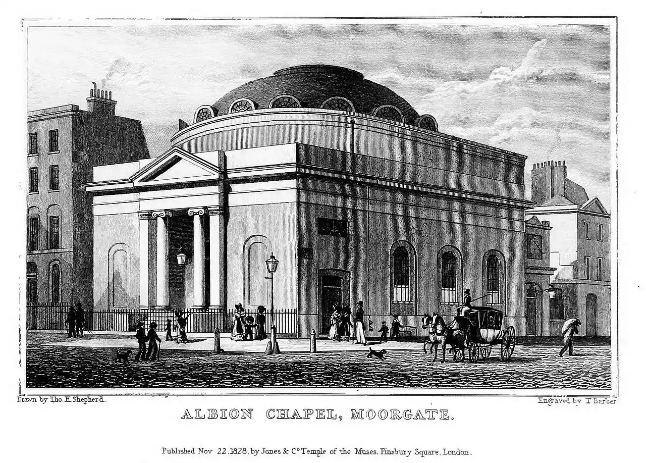 Albion Chapel was a Scottish Presbyterian chapel in the City of London, near Finsbury Circus, on the corner of London Wall and Finsbury Pavement. It was established by Reverend Alexander Fletcher on the site of the old Bethlem Royal Hospital in 1815 and demolished in 1879. It was designed by William Jay (1792/3-1837), who later became a leading architect in the United States. Read more on Wikipedia