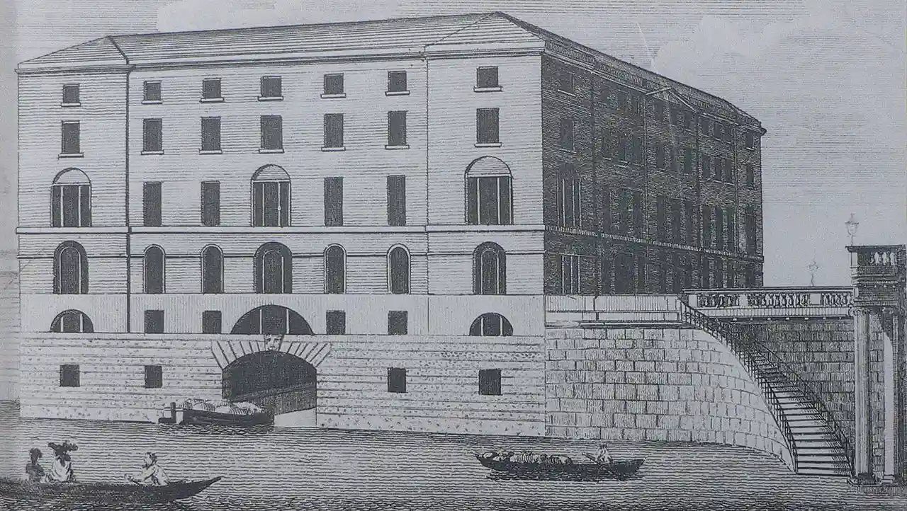 Albion Mills was a steam-powered flour mill situated on the southeastern side of Blackfriars Bridge in northern Southwark, London, then in the parish of Christchurch, Surrey. Matthew Boulton began plans for the mill as early as 1783; it was completed in 1786, and gutted by fire in 1791. Most of the notable engineering drawings and depictions of Albion Mills are in the Birmingham Central Library. Read more on Wikipedia