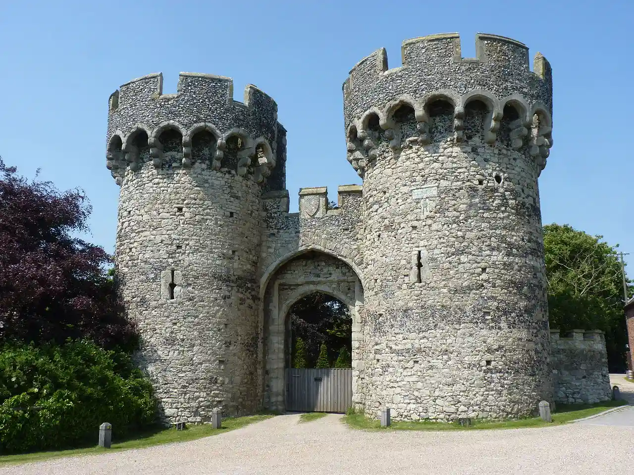 Cooling Castle is a 14th-century quadrangular castle in the village of Cooling, Kent on the Hoo Peninsula about north of Rochester. It was built in the 1380s by the Cobham family, the local lords of the manor, to guard the area against French raids into the Thames Estuary. The castle has an unusual layout, comprising two walled wards of unequal size next to each other, surrounded by moats and ditches. It was the earliest English castle designed for the use of gunpowder weapons by its defenders. Read more on Wikipedia
