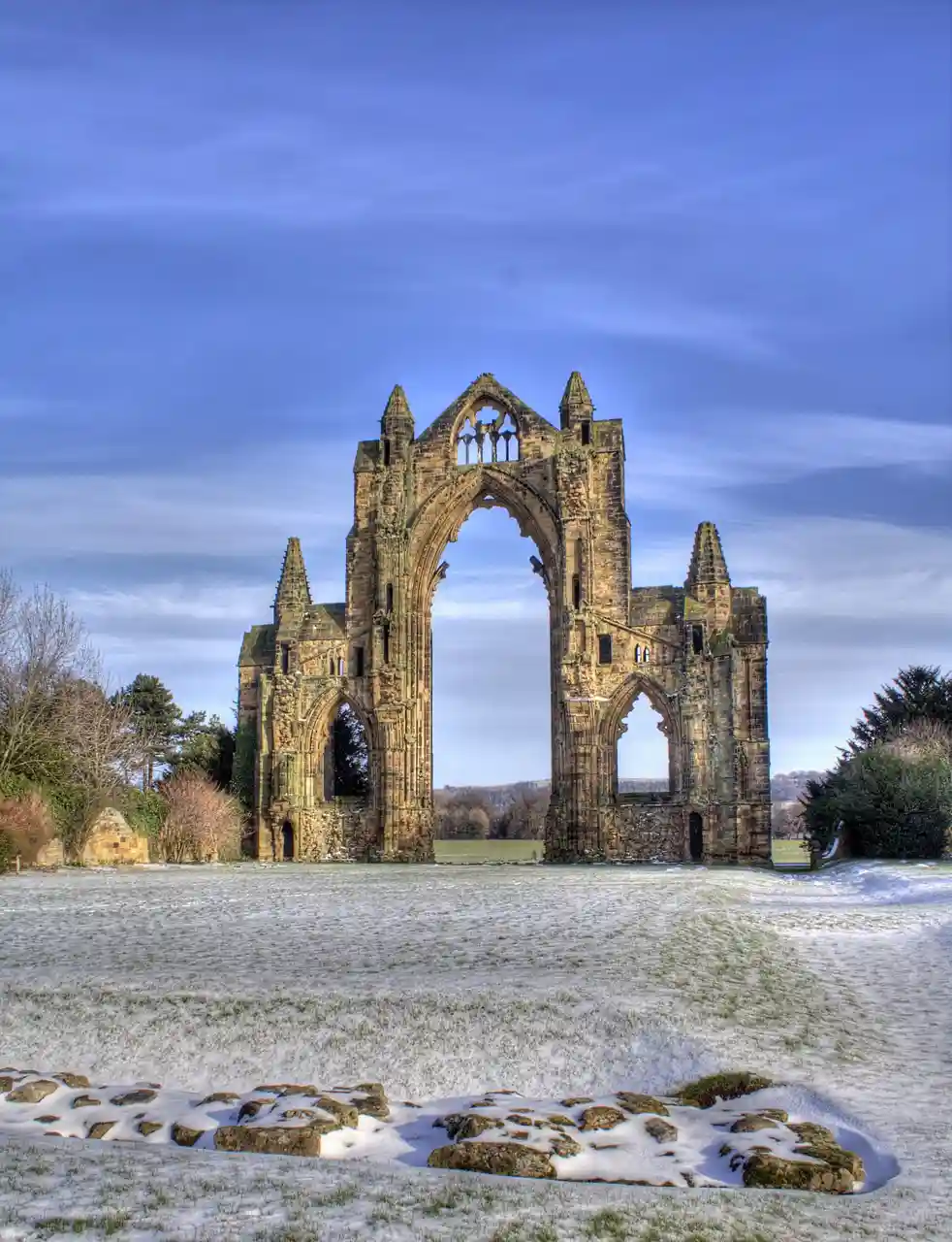 Gisborough Priory is a ruined Augustinian priory in Guisborough in the current borough of Redcar and Cleveland, North Yorkshire, England. It was founded in 1119 as the Priory of St Mary by the Norman feudal magnate Robert de Brus, also an ancestor of the Scottish king, Robert the Bruce. It became one of the richest monastic foundations in England with grants from the crown and bequests from de Brus, other nobles and gentry and local people of more modest means. Much of the Romanesque Norman priory was destroyed in a fire in 1289. It was rebuilt in the Gothic style on a grander scale over the following century. Its remains are regarded as among the finest surviving examples of early Gothic architecture in England. Read more on Wikipedia