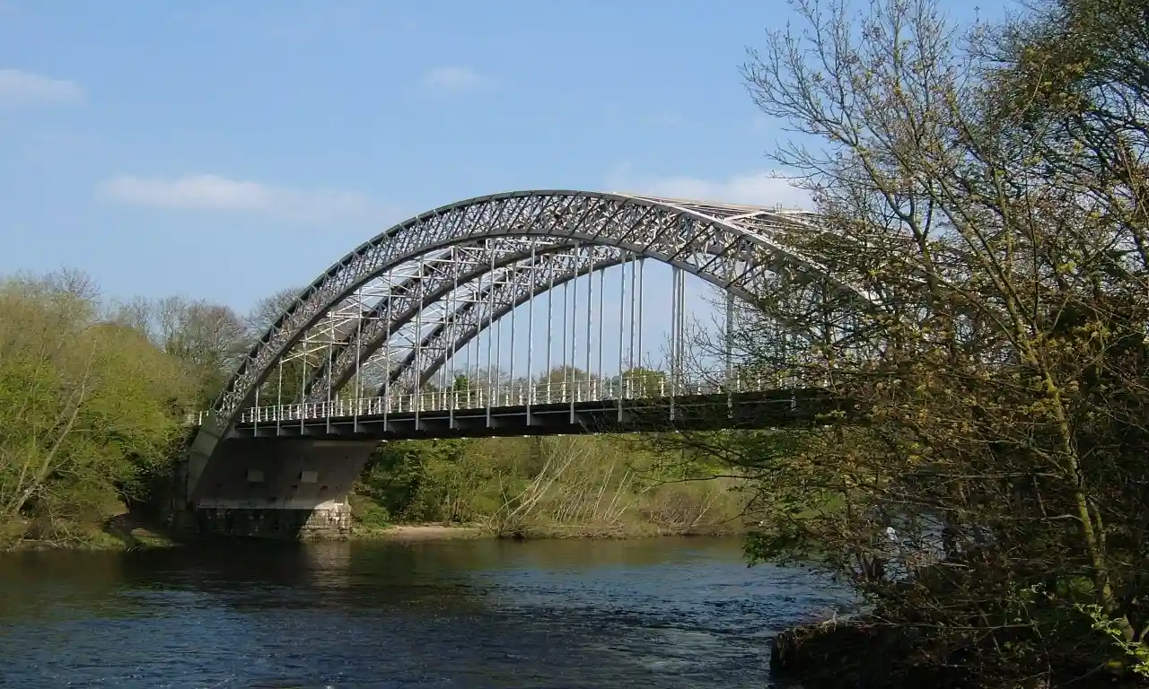 Wylam Railway Bridge (officially West Wylam Bridge, also known as Hagg Bank Bridge and locally as Points Bridge and Half-Moon Bridge) is a footbridge and former railway bridge crossing the River Tyne at Hagg Bank, approximately west of Wylam in Northumberland, England. Read more on Wikipedia