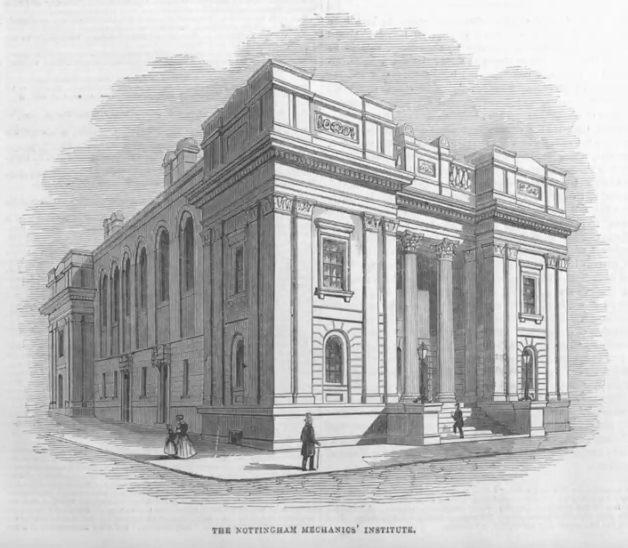 The Nottingham Mechanics' Institution was founded in 1837 in Nottingham to improve the knowledge of working men with classes and lectures, the provision of libraries, performances of music, drama and readings, and through social contact with a good cross-section of the better educated members of the community. Read more on Wikipedia