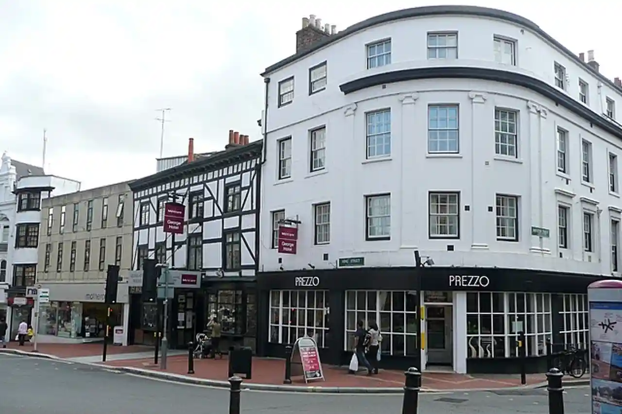 The George Hotel is a hotel and former coaching inn in the town of Reading in the English county of Berkshire. It is situated in the eastern end of the town centre, on the corner of King Street and Minster Street, next to The Oracle shopping mall. It is a Grade II listed building. Read more on Wikipedia