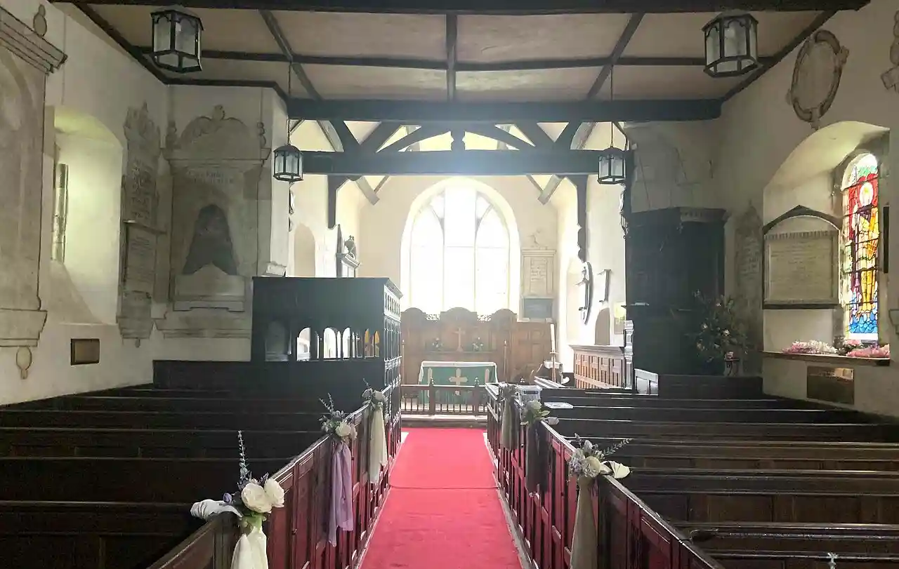 The Church of St John the Baptist is a Grade I listed Church of England church in Stokesay, Shropshire, England, adjacent to Stokesay Castle. The church first dates from around 1150, and was probably the chapel to the castle. It was badly damaged during the English Civil War, and rebuilt in 1654. The church consists of a nave, a south porch, a chancel and a west tower. The tower has three stages, a sundial, an embattled parapet, and a weathervane. The south doorway is Norman in style. The interior of the church, including the furnishings and wall paintings, dates from the late 17th century. It was listed Grade I on 12 November 1954. Church of St John The Baptist at Historic England Retrieved 24 July 2023 Read more on Wikipedia