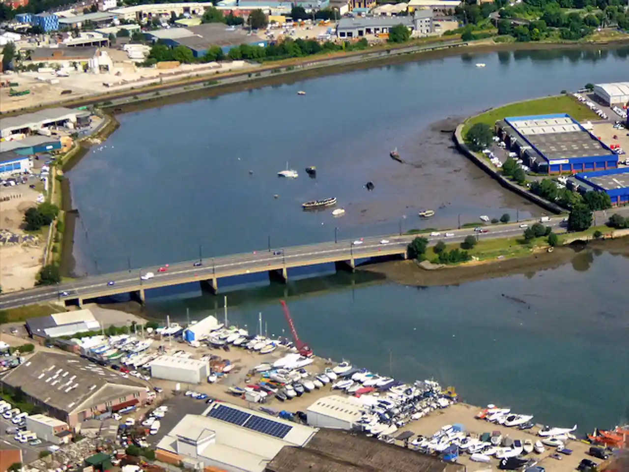 The Northam Bridge is a road bridge across the River Itchen in Southampton, England, linking the suburbs of Northam and Bitterne Manor. The current bridge was the first major prestressed concrete road bridge to be built in the United Kingdom. The bridge carries the A3024 road as a dual carriageway, with two lanes on each carriageway. Read more on Wikipedia