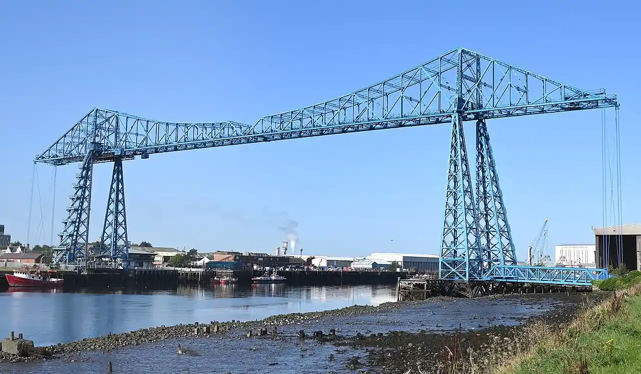 The Tees Transporter Bridge, also referred to as the Middlesbrough Transporter Bridge or locally as The Transporter, is a bridge over the River Tees in northern England. The northern side is in Port Clarence (Stockton-on-Tees) and the southern side is in Middlehaven (Middlesbrough). It is grade II* listed and the longest existing transporter in the world. and its winch house and piers are grade II listed. Read more on Wikipedia