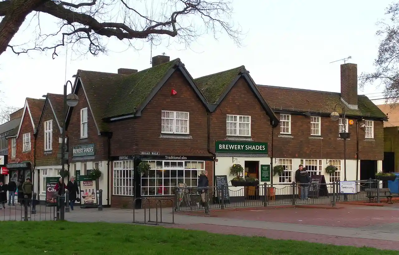 The Brewery Shades is a public house on the High Street in Crawley, a town and borough in West Sussex, England. The building, which stands on a corner site at the point where the town's ancient High Street meets the commercial developments of the postwar New Town, has been altered and extended several times; but at its centre is a 15th-century timber-framed open hall-house of a type common in the Crawley area in the Middle Ages. Few now survive, and the Brewery Shades has been protected as a Grade II listed building. Read more on Wikipedia