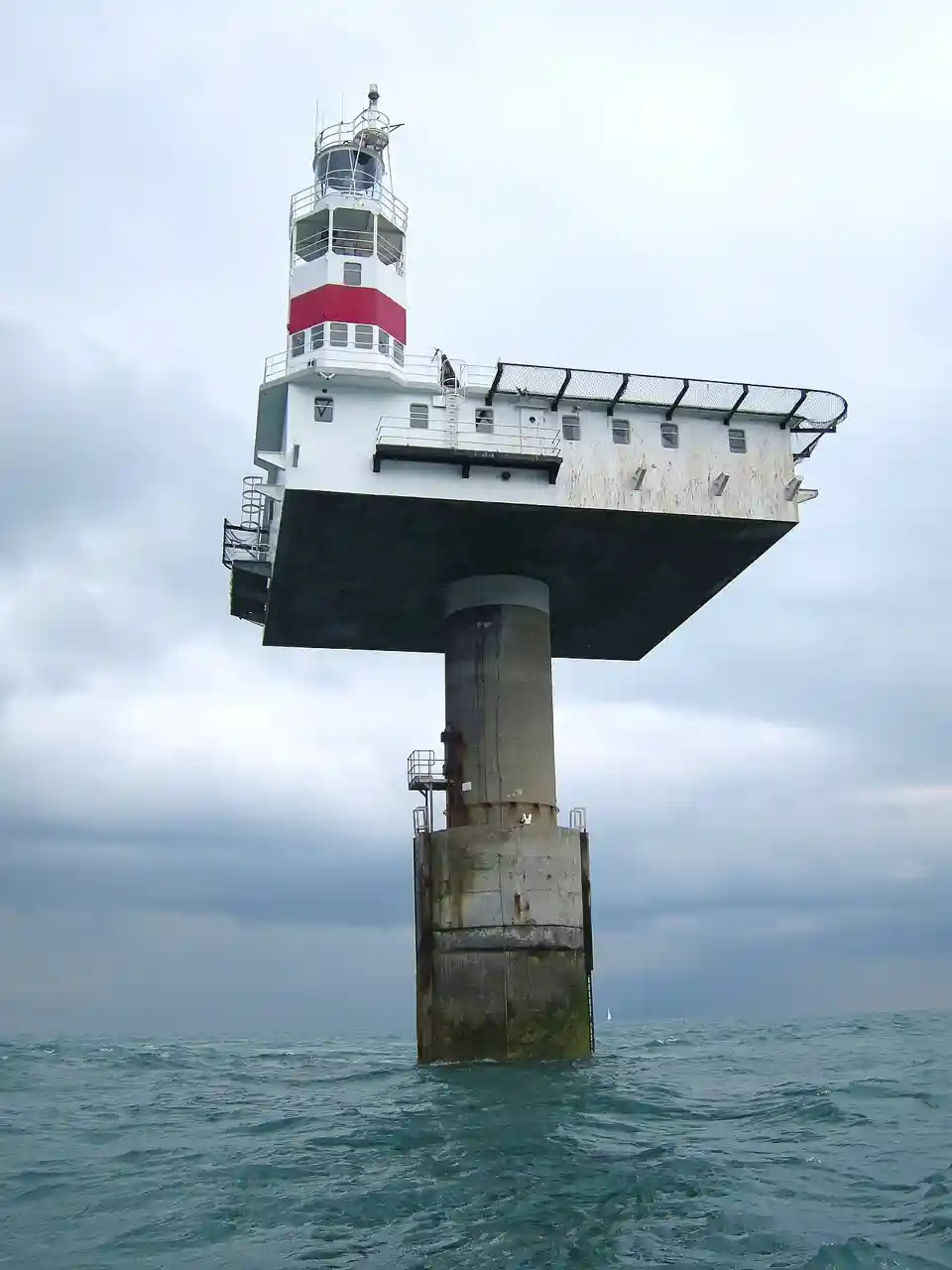 Royal Sovereign lighthouse is a decommissioned lighthouse marking the Royal Sovereign shoal, a sandbank offshore from Eastbourne. The structure's distinctive shape is easily recognised as the lighthouse tower is perched above a large platform (which functions as a helicopter deck) supported by a single pillar rising out of the water. Originally, the platform was manned by three full-time keepers, accommodation being contained in the 'cabin section' immediately below the platform. Additional accommodation was provided for up to four visiting maintenance workers. Read more on Wikipedia