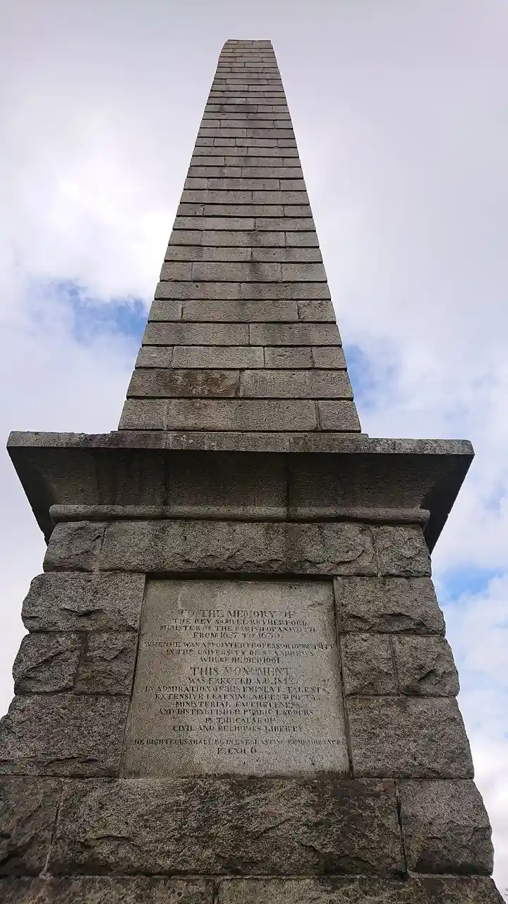 Rutherford's Monument is a commemorative monument between Anwoth and Gatehouse of Fleet in Dumfries and Galloway, Scotland. It is dedicated to the 17th-century theologian Samuel Rutherford, who had been minister at the nearby Anwoth Old Church. It was built in 1842, and takes the form of a granite obelisk atop a square base. It was badly damaged by lightning in 1847, and rebuilt in 1851. It is a Category B listed building. Read more on Wikipedia